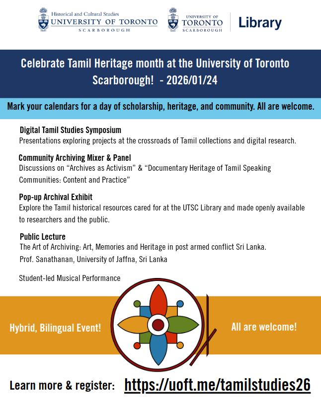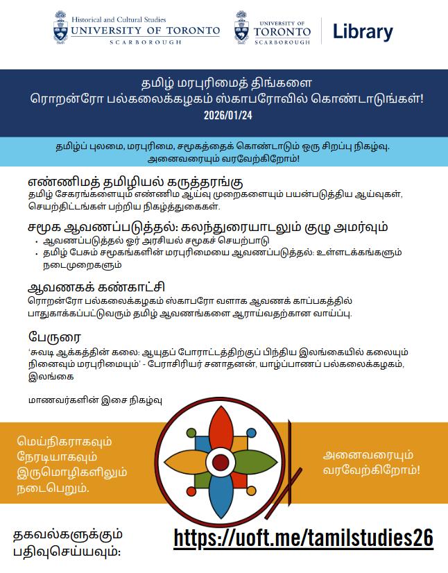கனடா டொரண்டோ நகரில் உள்ள, ரொறன்ரோ பல்கலைக்கழக ஸ்காபரோ நூலகத்தில் சனிக்கிழமை, சனவரி 24, 2026 அன்று நடைபெறவுள்ள தமிழ் மரபுரிமைத் திங்கள் கொண்டாட்டம் மற்றும் 4-ஆவது எண்ணிமத் தமிழியல் கருத்தரங்குக்கு உங்களை அன்புடன் வரவேற்கிறோம்!