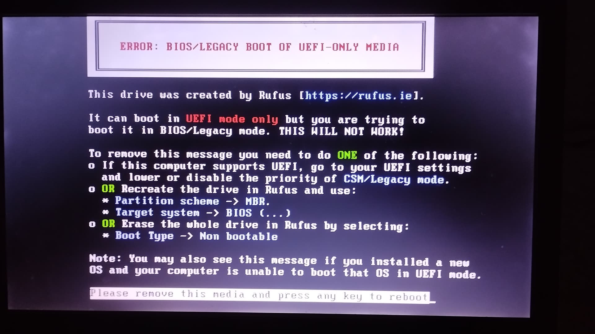 Rufus பயன்படுத்தி உருவாக்காமல் Etcher பயன்படுத்தி லைவ் பூட் பெண்டிரைவை உருவாக்கவும். பின் மீண்டும் முயற்சி செய்யவும்.
