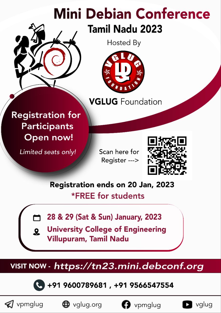 உலகின் முன்னணி FOSS அமைப்பான Debian உடன் இணைந்து VGLUG அறக்கட்டளை நமது தமிழகத்தில் மினி டெபியன் மாநாட்டை (MiniDebConf Tamil Nadu 2023) விழுப்புரத்தில் நடத்த உள்ளது. இந்திய அளவில் 2023-இல் டெபியன் இந்தியா அமைப்பு நடத்தவுள்ள மாநாட்டிற்கான முன்னோட்ட நிகழ்வாக இந்த மாநாடு அமையவுள்ளது என்பதை மகிழ்வுடன் தெரிவித்து கொள்கிறோம்.