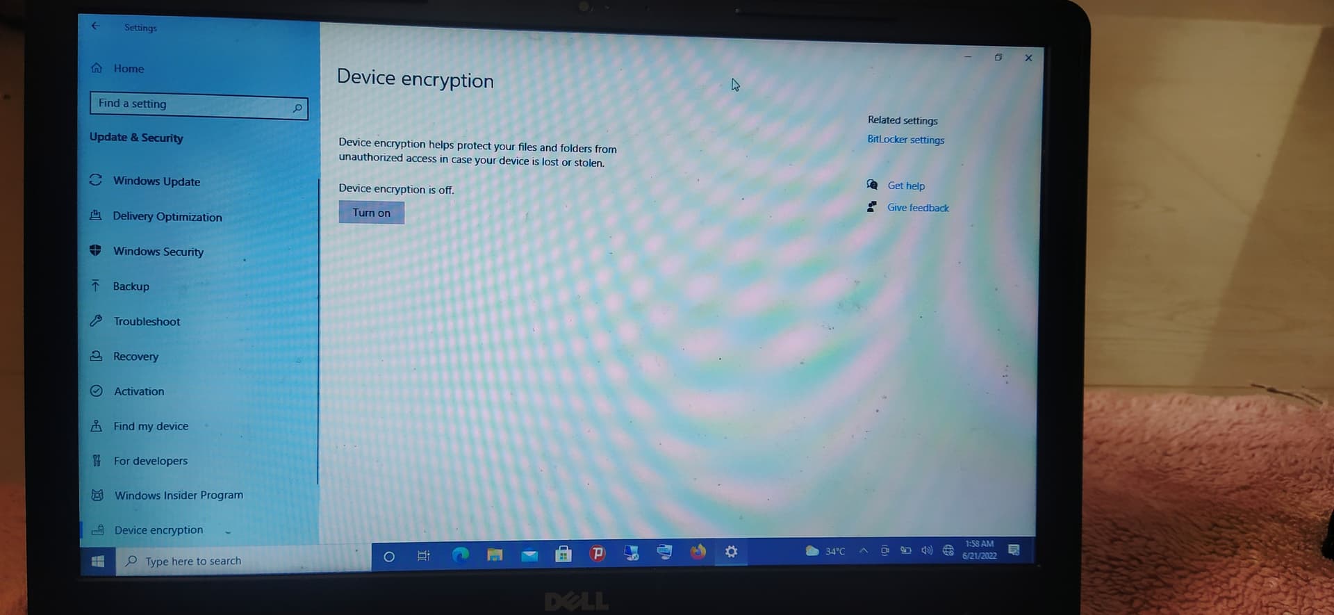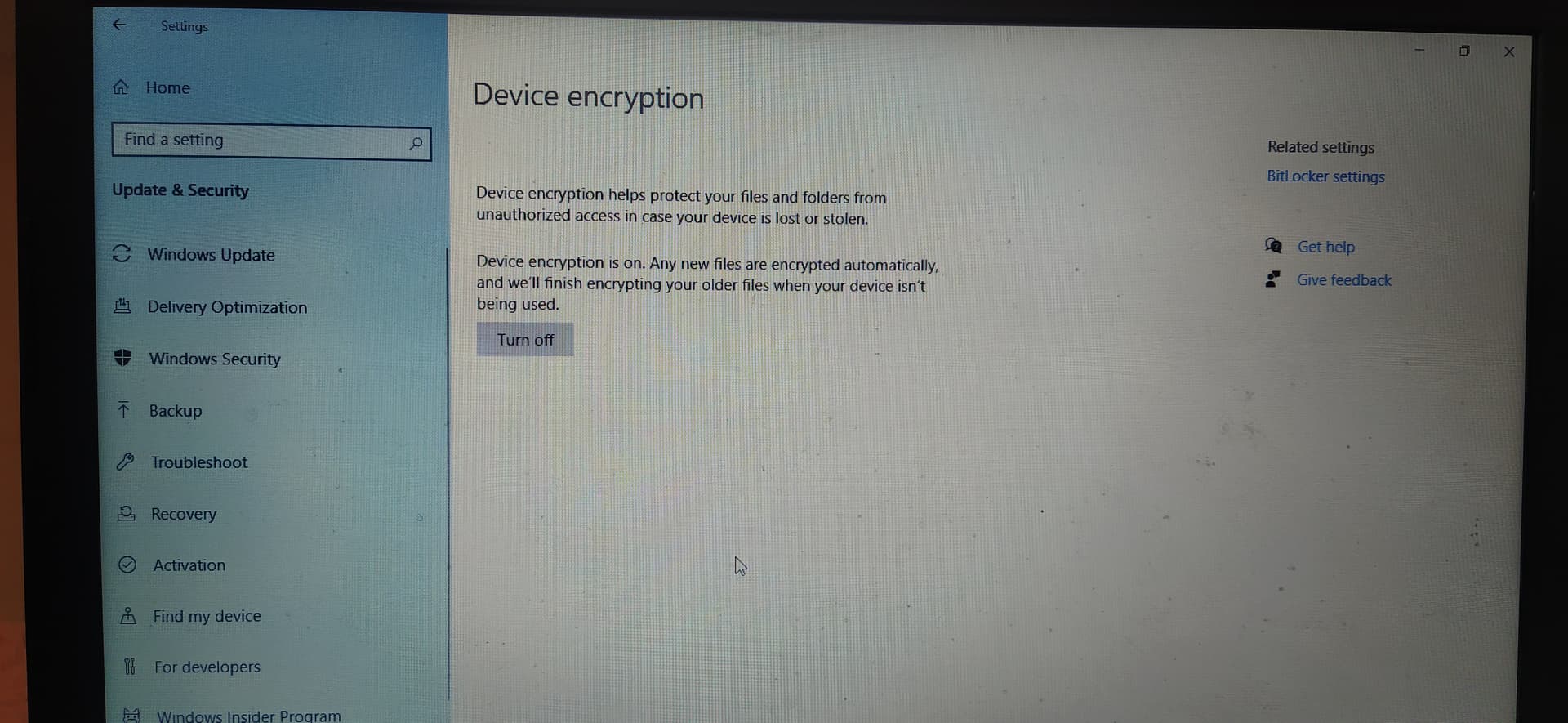 ஸ்டார்ட் → செட்டிங்ஸ் சென்று Device Encryption ல் Turn on வருகின்றதா என்று பார்க்கவும்.