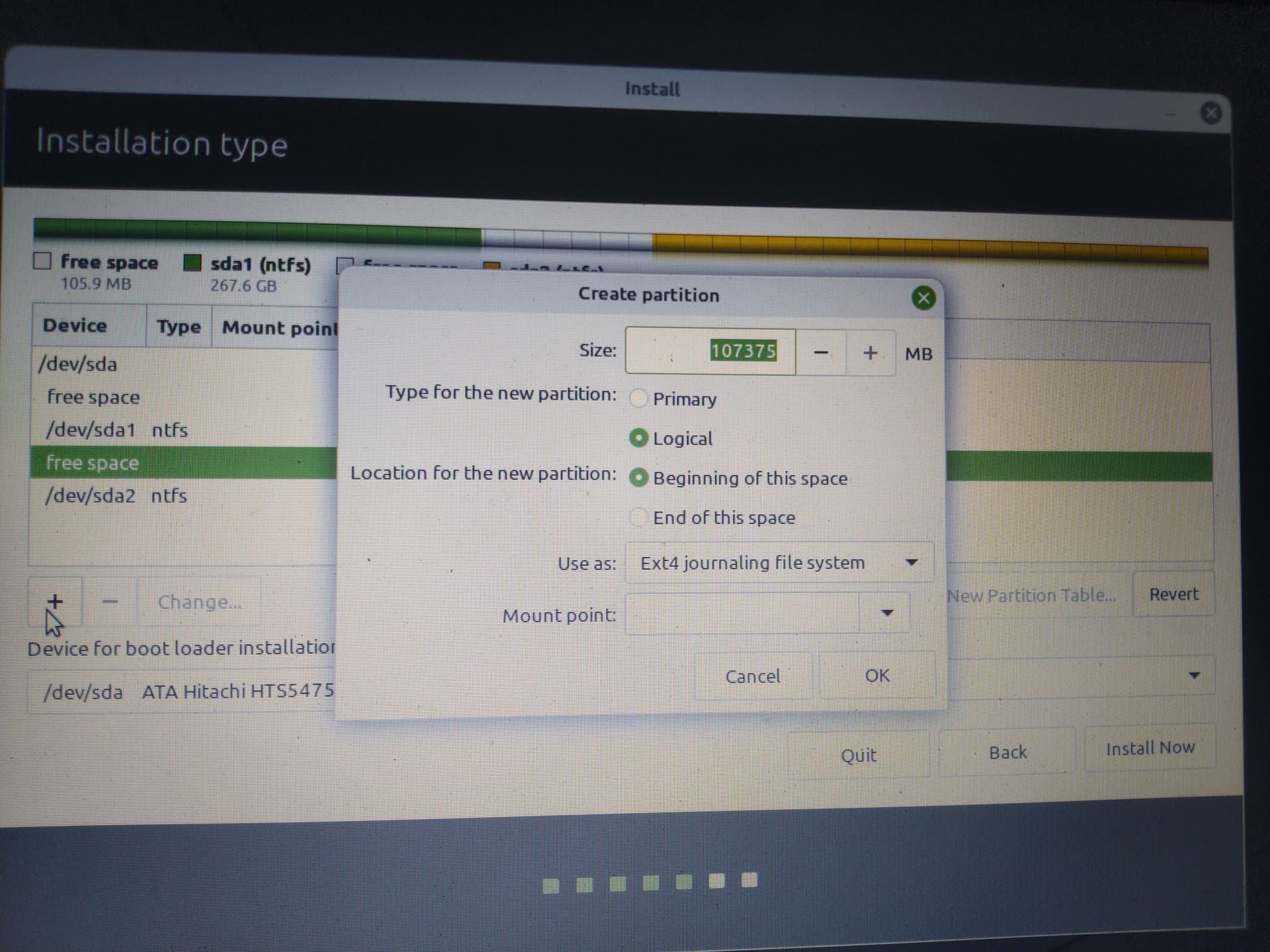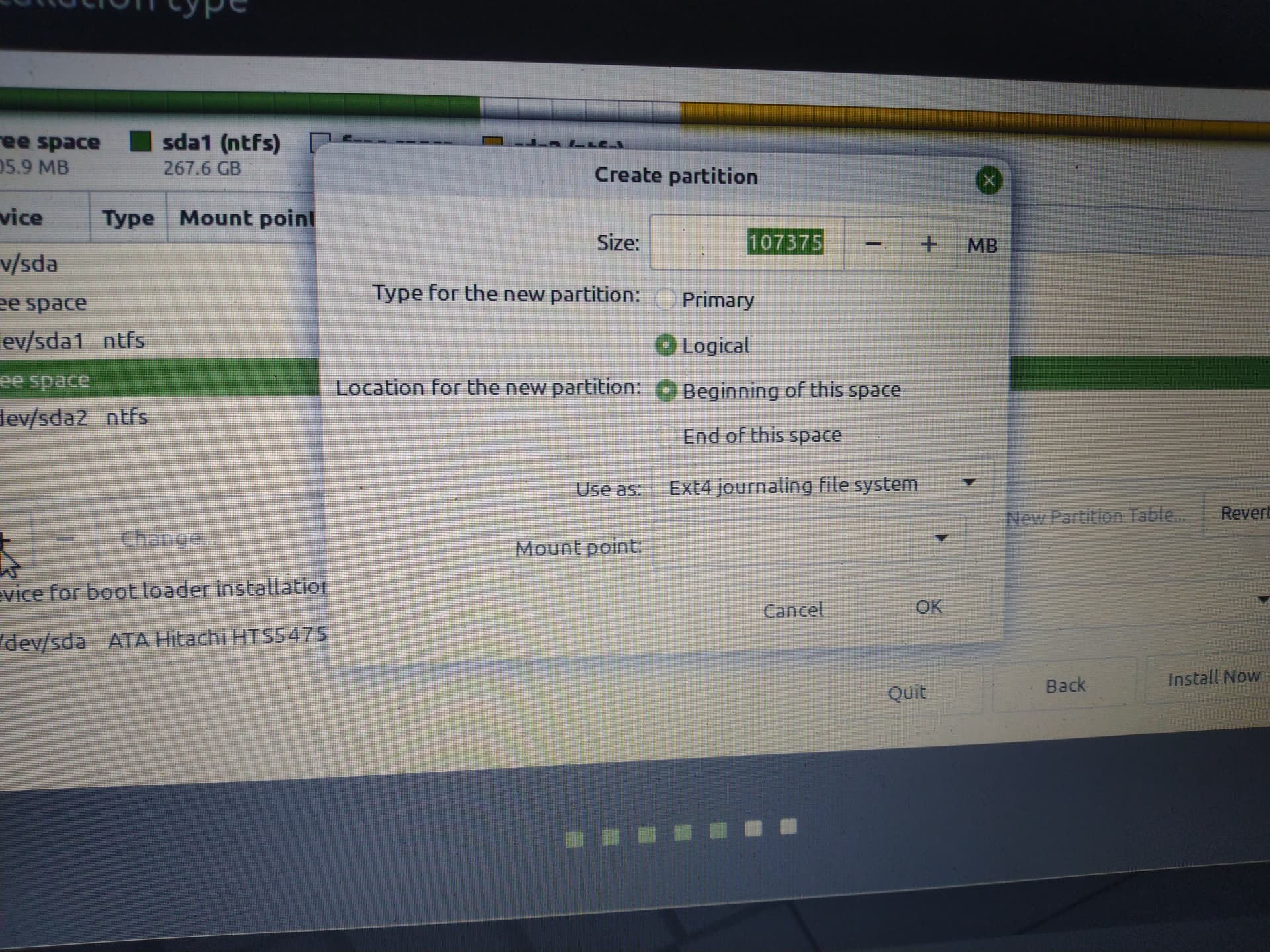 type of the new partition ல் primary தேர்வு செய்யவும், பின் Mount point ல் / என்று தேர்வு செய்து ok கிளிக் செய்யவும். பின் Install now என்று கொடுக்கவும்.