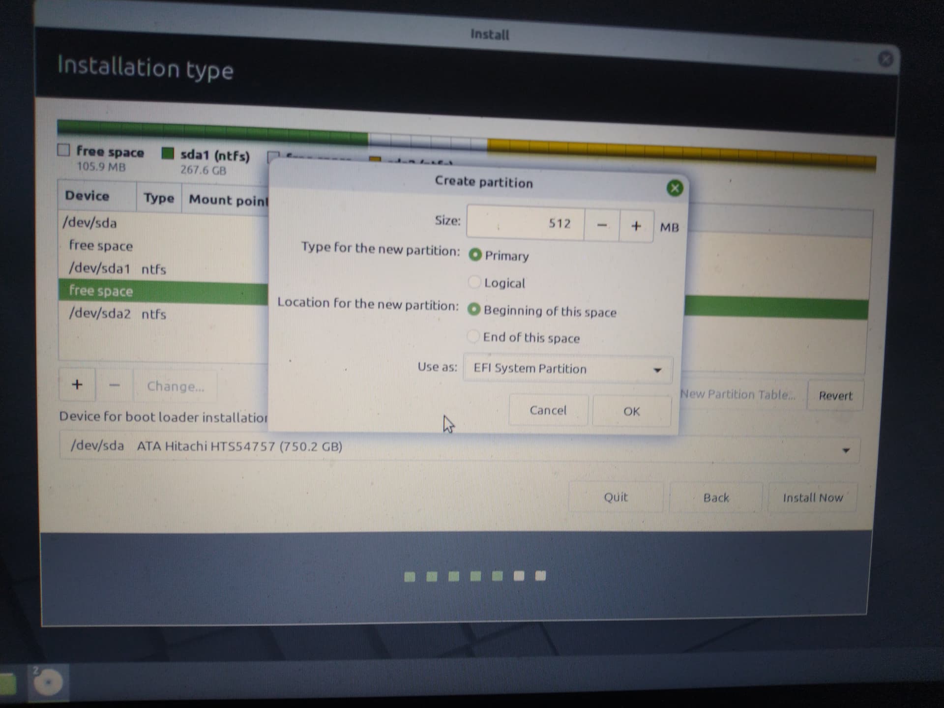 Type of the new partition ல் Primary தேர்வு செய்யவும், பின் Use as ல் EFI சம்பந்தப்பட்ட ஒரு தேர்வு இருக்கும். அதை தேர்வு செய்யவும். பின் Mount point ல் /boot என்று தேர்வு செய்யவும். வரும் திரையை பகிரவும்.