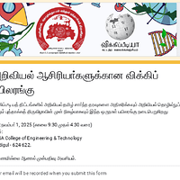 திண்டுக்கல்லில் ஜனவரியில் நடைபெறவுள்ள அறிவியல் மாநாட்டின் முன் நிகழ்வாக அறிவியல் தமிழ் உள்ளடக்கங்களை அதிகரிக்க விக்கிப்பீடியப் பயிற்சியினை மாவட்ட நிர்வாகத்துடன் இணைந்து தமிழ் விக்கிப்பீடியா சார்பாக நவம்பர் 1 அன்று நடைபெறுகிறது. அதில் ஆர்வமுள்ள ஆசிரியர்கள்/ஆர்வலர்கள் முன்பதிவு செய்து கொண்டு கலந்து கொள்ளலாம்.